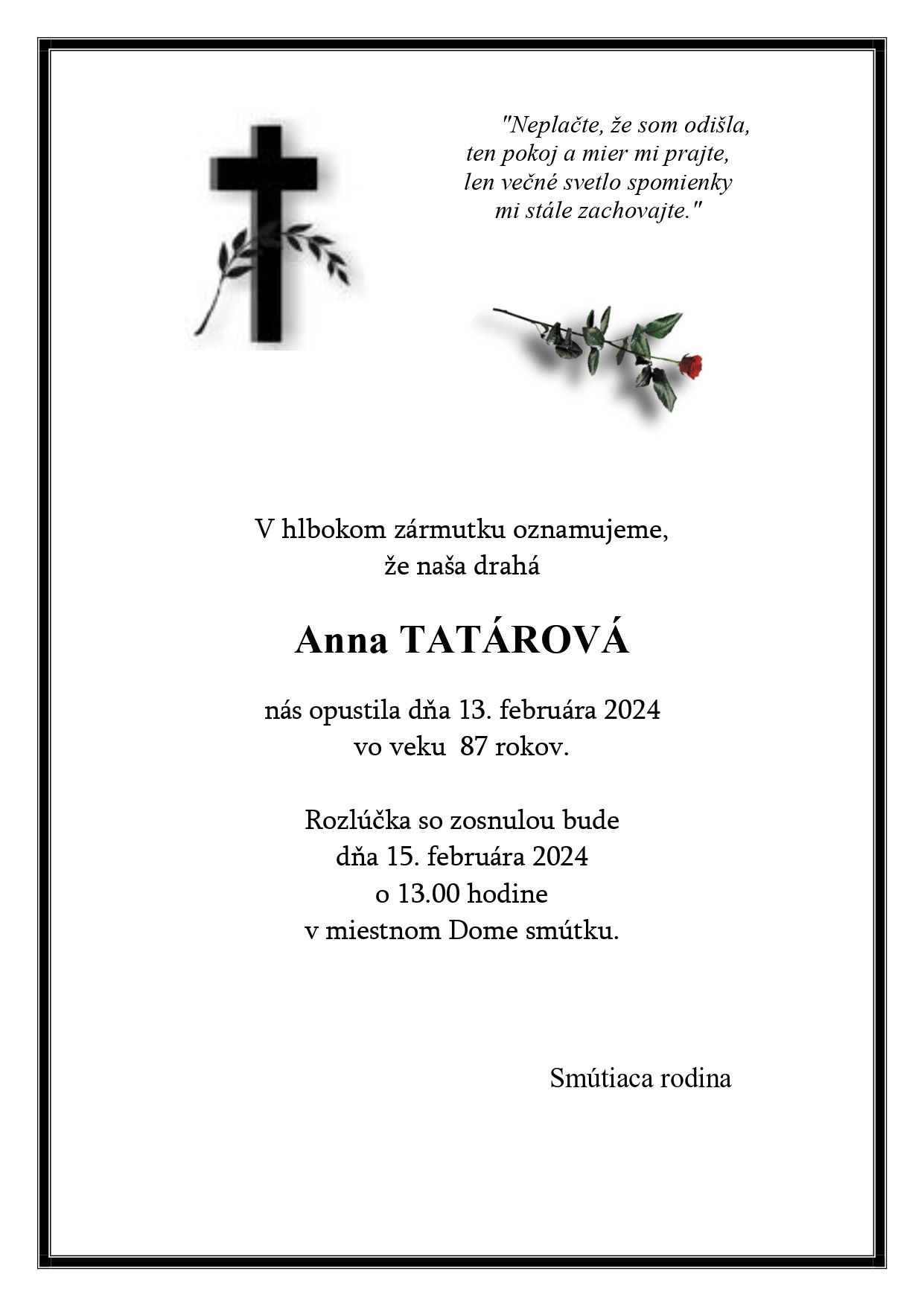 Anna Tatárová, bytom Hažín č.94, zomrela dňa 13.2.2024. Večerné modlenie sa koná v stredu 14.2.2024 o 17.00 hod. v miestnom Dome smútku.