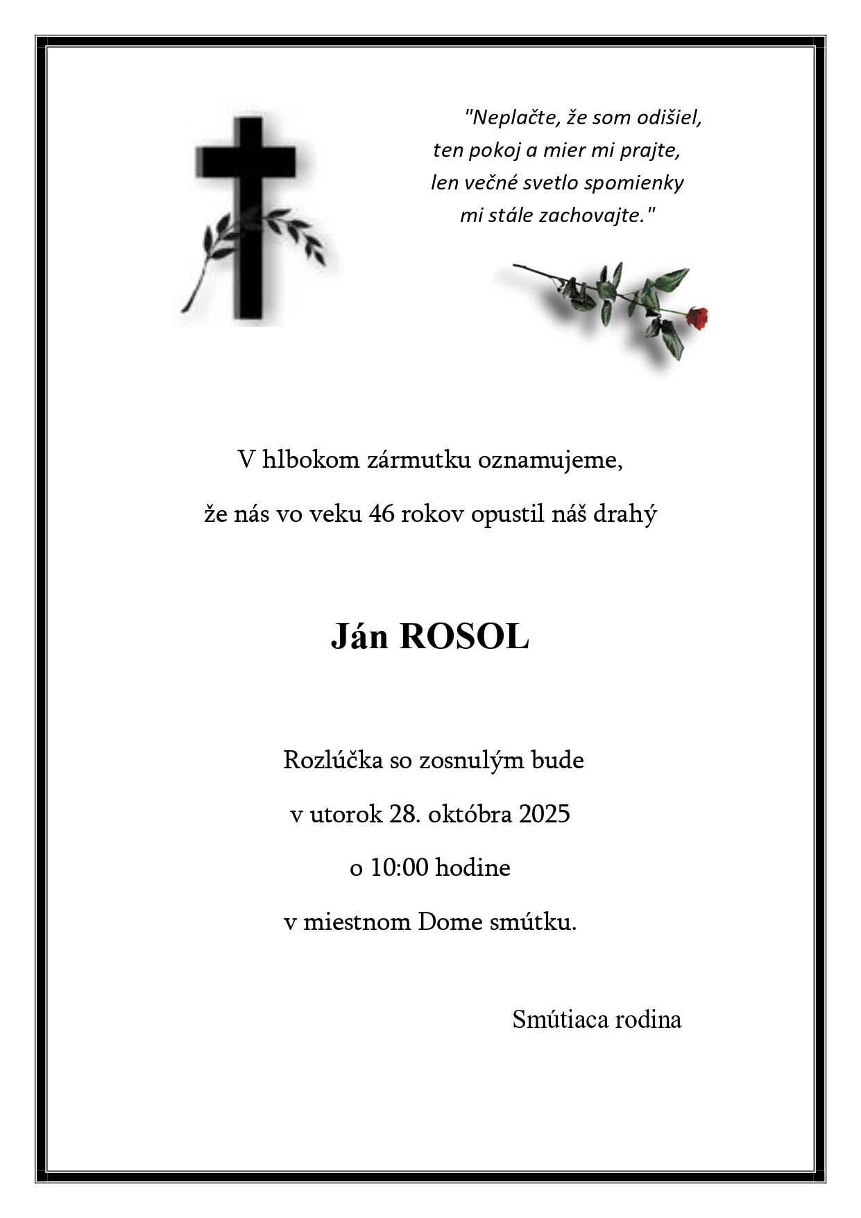 Smútiaca rodina oznamuje občanom, príbuzným a známym, že nás navždy opustil Ján Rosol.(Hažín č.141)